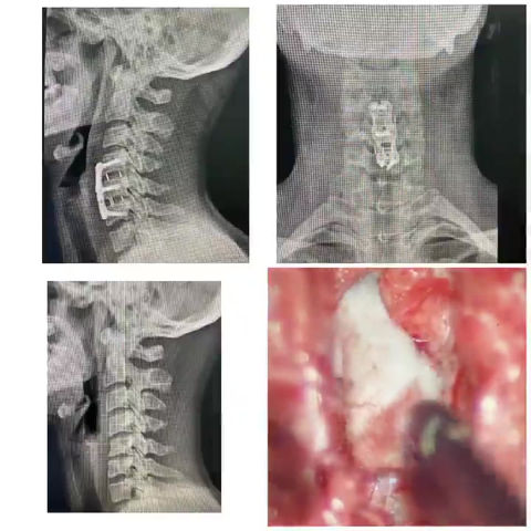 Dr. Basil performed a very complicated and critical surgery by the patient and removed microscopic tow vertebras C4 and C5 to decompress the spinal cord after adhesiolysis the Bone from the Thecal sack. Then he reconstruct the spinal Alignment with vertebral body replacement C4 and C5 with Platte and screws from the front ( anterior) and 4 days later from the back ( posterior) screws fixation C3-C6 for the maximal stability. Both surgeries done without complications.